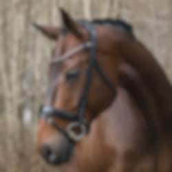 Ein anatomischer Trensenzaum mit einem einzigartigen Genickstück, das Druck- und Muskelschäden in den Hals- und Nackenmuskeln des Pferdes vorbeugt. Die Trense ist mit einem dünnen Stirnriemen mit schicken silbernen Messingvierecken ausgestattet.