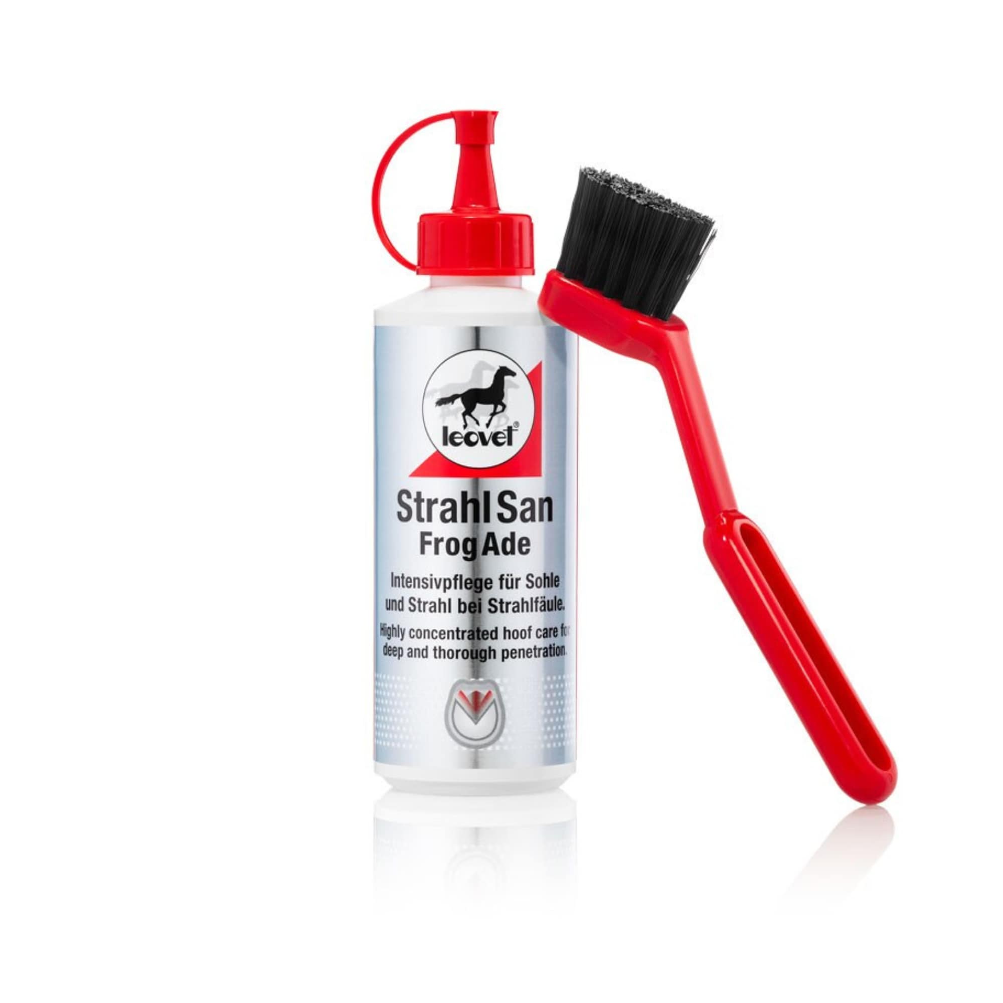 Intensivpflege gegen Strahlenfäule für Pferde, FrogAde von Leovet. FrogAde wird verwendet, wenn das Pferd Strahlenfäule und eine schlechte Sohle hatte. Nach einer gründlichen Reinigung der Sohle und des Strahls wird FrogAde mit der mitgelieferten Bürste einmassiert, bis Schaum entsteht. Wenden Sie FrogAde am Anfang täglich und dann 2-3 mal pro Woche an, bis das Problem gelöst ist. 200 ml