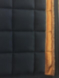 Entwerfen Sie Ihre eigene Spring- oder Dressurschabracke - ganz nach Ihrem Geschmack. Dies ist eine Baumwollschabracke von Mias RS mit gerader Kante und großer, quadratischer Steppung (5 cm), bei der Sie das meiste selbst designen können. Die Schabracke im Design 2 hat ein flaches Zierband, das entlang des hinteren Rands der Schabracke verläuft, eine 5-6 mm Schnur am hinteren Rand und ein Band am Saum, das die gesamte Schabracke umgibt. Die Farben werden in der Regel von innen nach außen angegeben mit Zierband/Schnur/Saumband. Das Band am Saum gibt es in der gleichen Farbe wie das Zierband und wird Ton in Ton gemacht, soweit nicht anders angegeben. Sie wählen aus Mias verschiedenen Farboptionen für die Schabracke, die Kordel und den Saum aus. Dressur oder Springen und Größe 15, 16, 17, 18 ", wobei 17" für Pferde die gebräuchlichste ist.