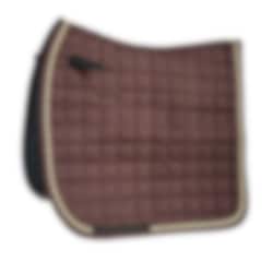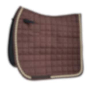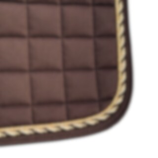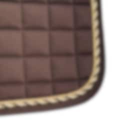 Diese Dressurschabracke ist in einer schönen braunen Farbe mit großer Steppung und hat zwei Zierkordeln, eine in Braun und eine in Braun/Goldglitzer/Weiß. Das Band, dass an der Kante der Schabracke entlang verläuft, ist braun.