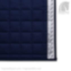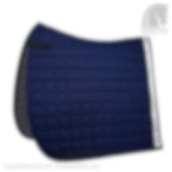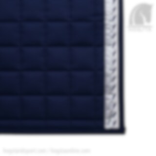 Wunderschöne, marineblaue Dressurschabracke mit silberner Glitzernaht von Mias RS. Die Dressurschabracke hat gerade Ränder, große quadratische Steppung (5 cm) und am Widerrist mit weichem Teddyfleece gefüttert.
