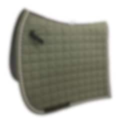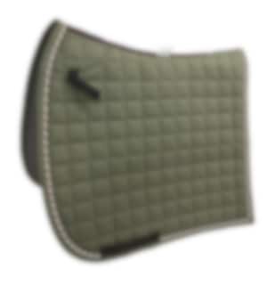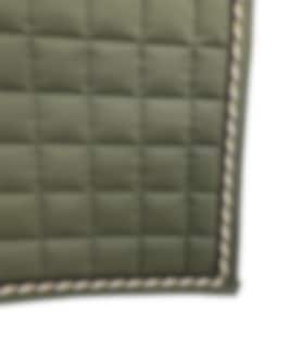 Eine extrem schöne und stilvolle Dressurschabracke in Olivgrün mit Paspeln in Gold und Gold /Braun/Perle. Die Dressurschabracke hält, wie alle Produkte von Mias RS, eine sehr hohe Qualität mit einer guten Passform.