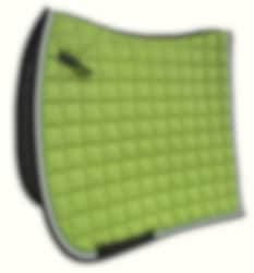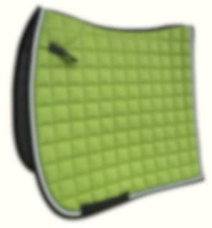 Pikantgrüne Dressurschabracke mit schwarzem Rand und zwei Zierkordeln, eine in Perlmutt und eine in Grün. Große gesteppte Quadrate (5 cm) und 17 Zoll groß.