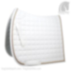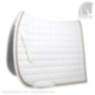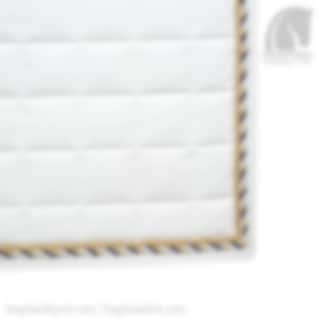 Weiße Dressurschabracke von Mias RS. Eine wunderschöne und stilvolle Dressurschabracke von Mias RS in Weiß mit Kordeln in Gold und Gold/Marine/Perlmutt. Die Schabracke hat große gesteppte Karos (5 x 5 cm) und bietet wie alle Schabracken von Mias RS sehr hohe Qualität und sehr gute Passform. Diese Dressurschabracke eignet sich hervorragend für Training und Turnier. Größe Full.