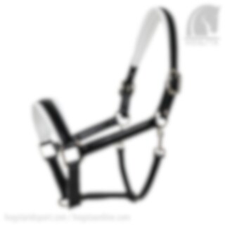 Lederhalfter von höchster Qualität von Otto Schumacher. Das Lederhalfter ist breit mit weicher Polsterung an Hals und Nase in der Farbe Schwarz mit weißer Polsterung. Die Sattlerei Otto Schumacher ist bekannt für ihre hohe Leder- und Verarbeitungsqualität, und dieser exquisit ausgeführte Halfter ist keine Ausnahme.
