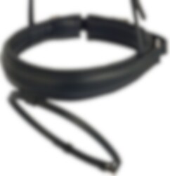 Nasenriemen XL Tropfenförmig von Otto Schumacher für Trense, mit Knopfverschluss, mit rund genähtem oder glattem Backenstück/Genickriemen. Weich gefütterter, 5 cm breiter, sich verjüngender, anatomischer Nasenriemen für Trense. XL bedeutet, dass er über dem Nasenrücken extra breit ist. Die Lederarbeiten der Sattlerei Otto Schumacher sind weithin bekannt und ihre Nasenriemen sind keine Ausnahme. Dieser Nasenriemen ist in Schwarz oder Negro erhältlich, das Futter Ton-in-Ton oder Weiß. Für Sonderbestellungen gibt es zusätzliche Optionen. Zusätzlich gibt es auch Messingschnallen oder warum keinen lackierten Nasenriemen.