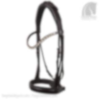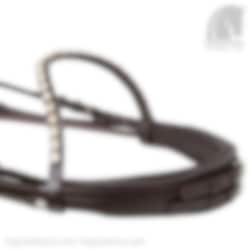 Rundgenähte braune Kandare im Modell München Feel Good mit einem unglaublich schönen und exklusiven Swarovski-Stirnband, das tropfenförmige Kristalle in der Farbe Golden Shadow hat.