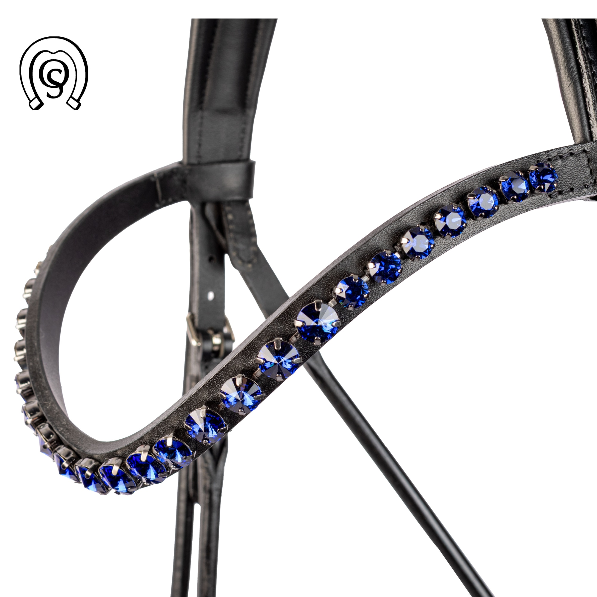 Das wunderschöne Stirnband ist im Modell FOCUS gehalten, was bedeutet, dass es sich um ein geschwungenes Lederstirnband mit großen Swarovski-Kristallen in der Farbe Dark Sapphire B in verschiedenen Größen handelt. An den äußeren Rändern befinden sich kleinere Steine mit 8 mm, gefolgt von 10-mm-Steinen, während in der Mitte Steine mit 12 mm eingesetzt sind. Diese Anordnung ist ein weiteres Detail, das die gesamte Trense einzigartig macht und besonders hervorstechen lässt.