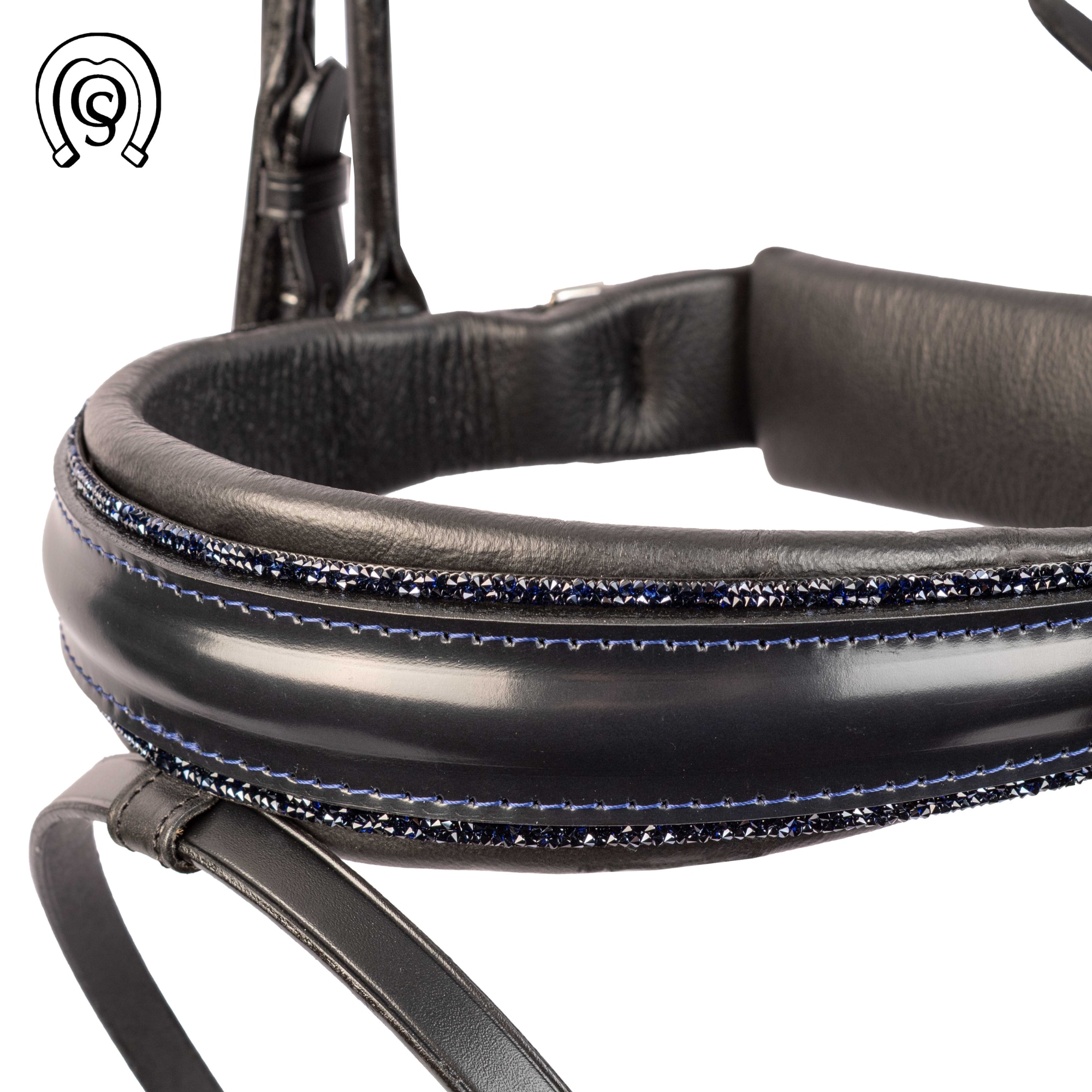 Der anatomisch geformte Nasenriemen ist mit einer speziellen Kombination aus mattblauem Leder und schimmernder Fineline-Paspel mit Swarovski-Steinen in der Farbe Midnight Blue verziert.