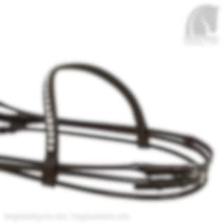 Schöne rundgenähte braune Trense mit weiß gepolstertem Nasenriemen von der Sattlerei Otto Schumacher mit schönem klassischem Stirnband mit Steinen von Swarovski in der Farbe Crystal.