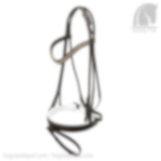 Dies ist eine rundgenähte braune Trense München mit einem 4 cm breiten Nasenriemen mit weißer Polsterung und schwedischer Verschnallung.