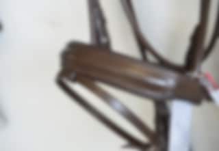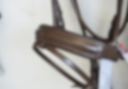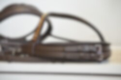 Dies ist eine rundgenähte braune München Feel Good Trense mit dem etwas breiteren, gut gepolsterten Genickstück, das Feel Good genannt wird, weil es weicher am Pferdenacken anliegt. Der Nasenriemen dieser rundgenähten Trense ist 4,5 cm breit und im Cut-Back-Modell, was bedeutet, dass der Nasenriemen an den Seiten, an denen das Pferd am wenigsten Platz am Gebiss hat, zurückgeschnitten und somit schmaler ist. Der Verschluss des Nasenriemens wird zurückgeknöpft und hinten verschnallt.