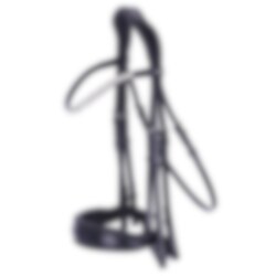 Elegante und funktionale Dressurkandare mit anatomischem Genickstück, ergonomischem Nasenriemen und weicher Polsterung. Schlichtes Design mit Kristalldetails und glitzernder Paspelierung.