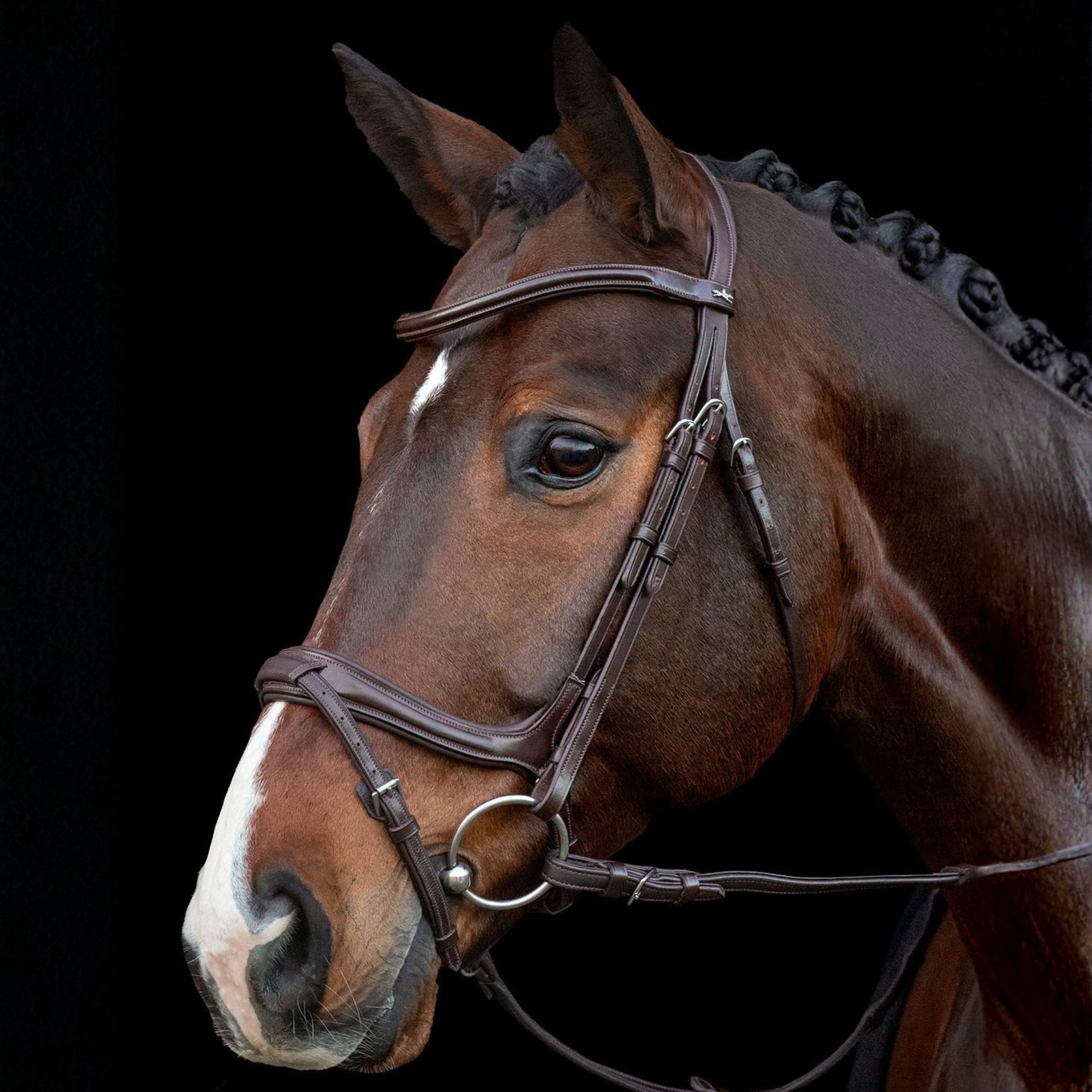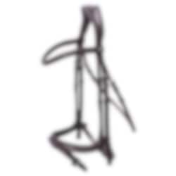 Anatomisch geformte Trense aus dunkelbraunem Leder mit innovativem Nasenriemen, gepolstertem Sperrriemen in druckentlastendem Kanal und bewährtem anatomischem Genickstück.