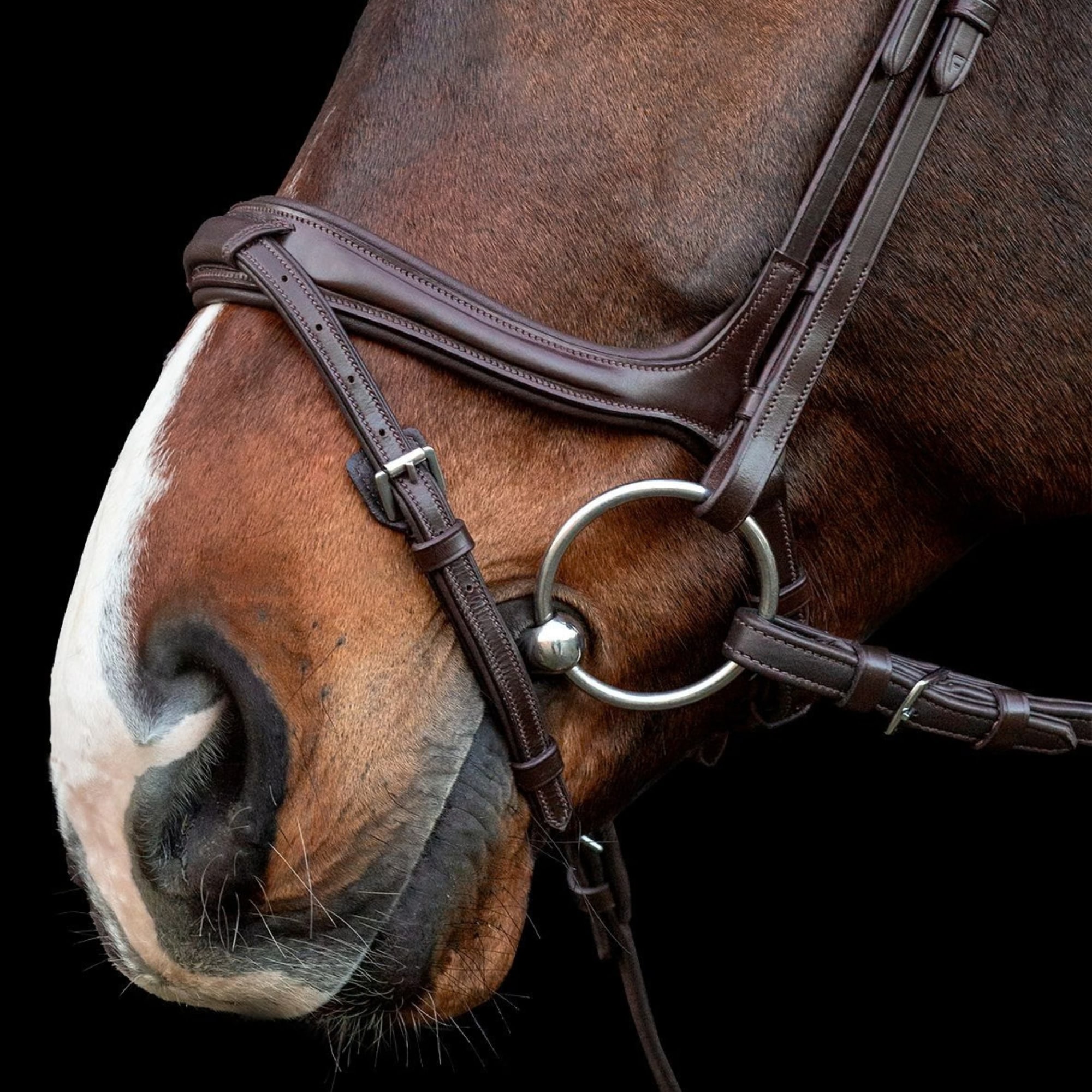 Ein besonderes Merkmal ist der gepolsterte Sperrriemen, der oben auf dem Nasenriemen in einem breiten, nylonverstärkten Kanal befestigt ist. Dies reduziert den Druck auf den Nasenbereich des Pferdes und erleichtert das freie Atmen - besonders wichtig bei starker Anstrengung.