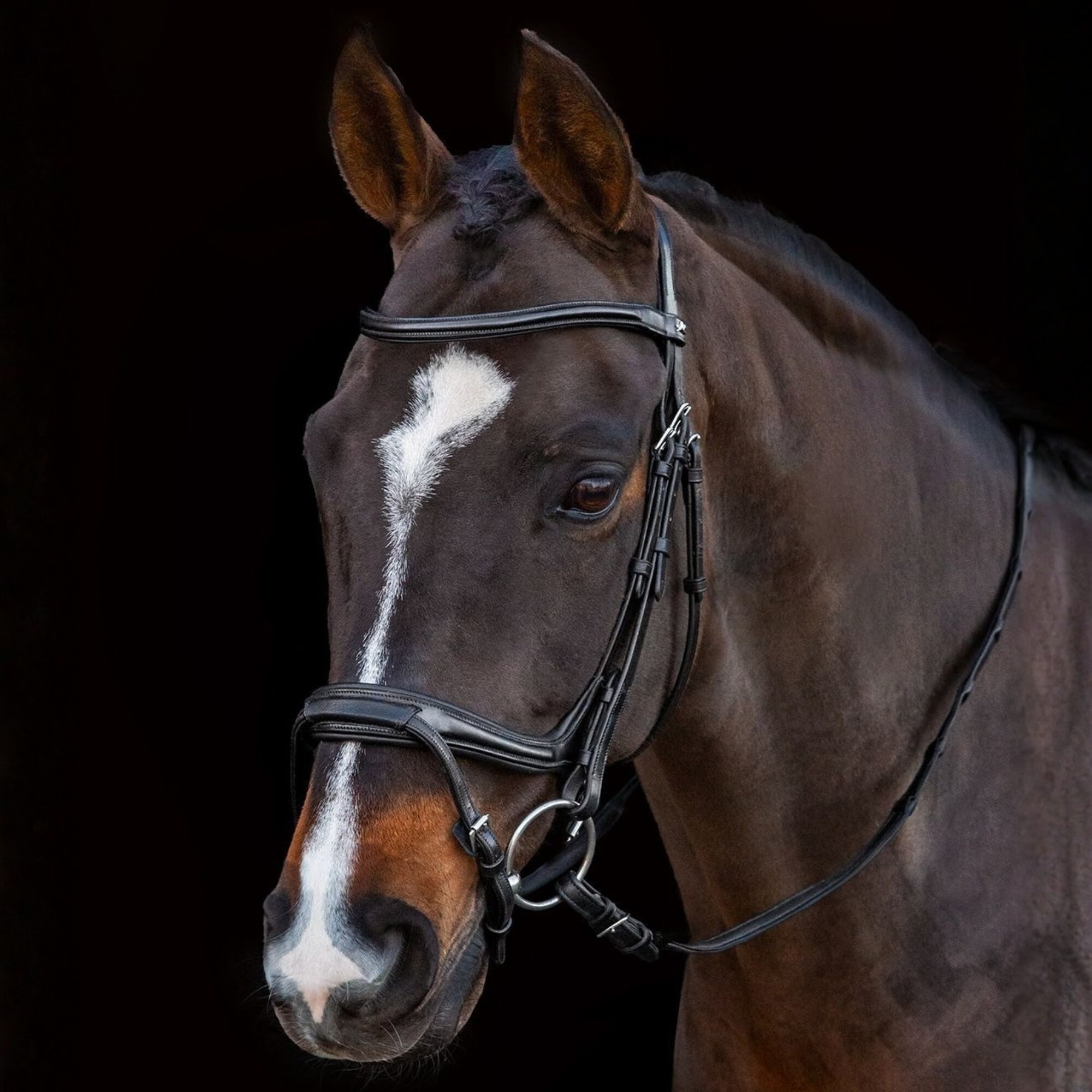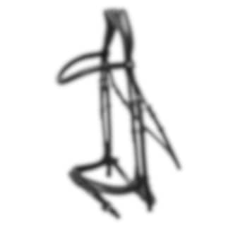 Anatomisch geformte Trense aus schwarzem Leder mit innovativem Nasenriemen, gepolstertem Sperrriemen in druckentlastendem Kanal und bewährtem anatomischem Genickstück.