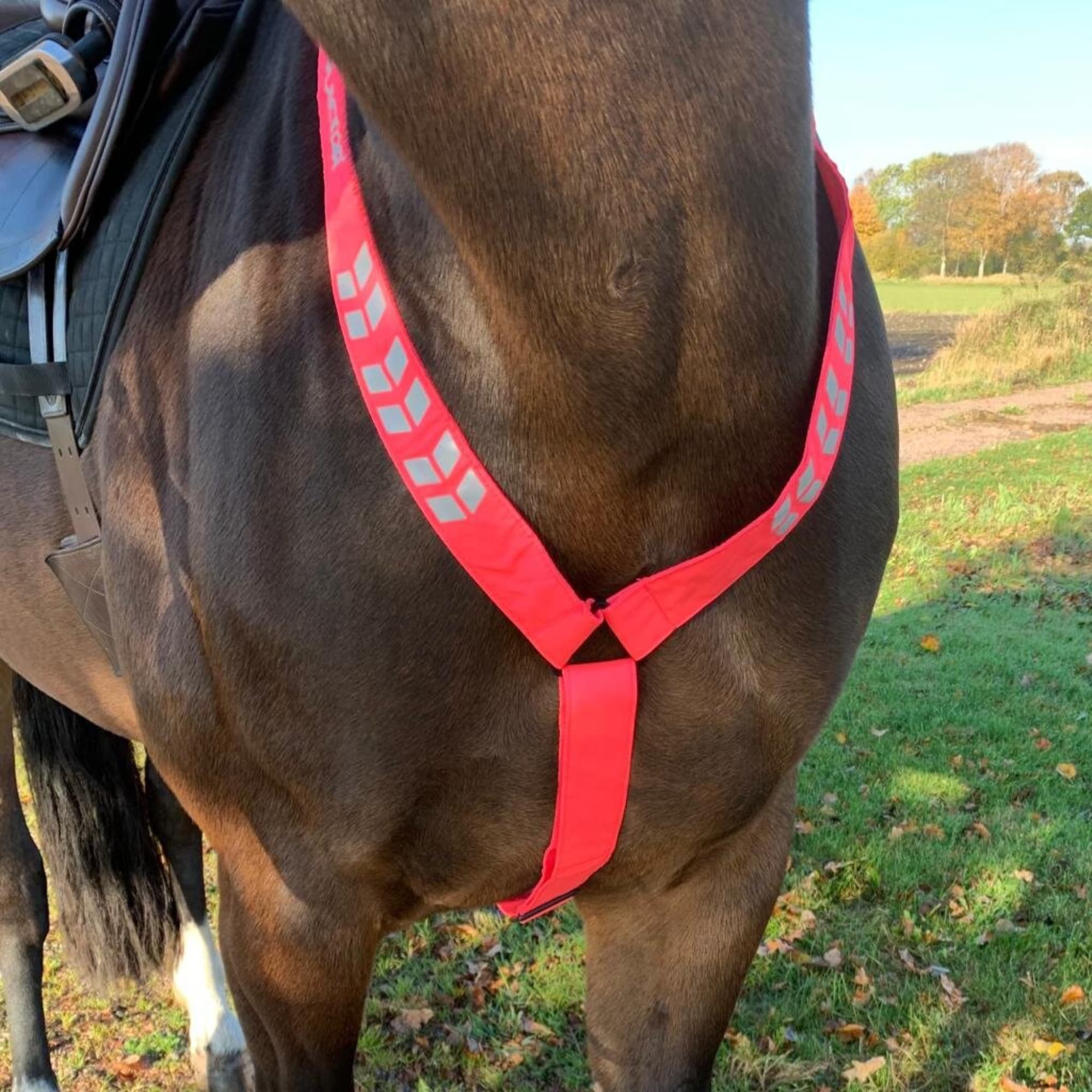 Reflexstreifen auf beiden Seiten machen Sie in der Dunkelheit des Winters sichtbar. Anpassbar für Pony und Pferd. Einfach am Sattelgurt zu befestigen.